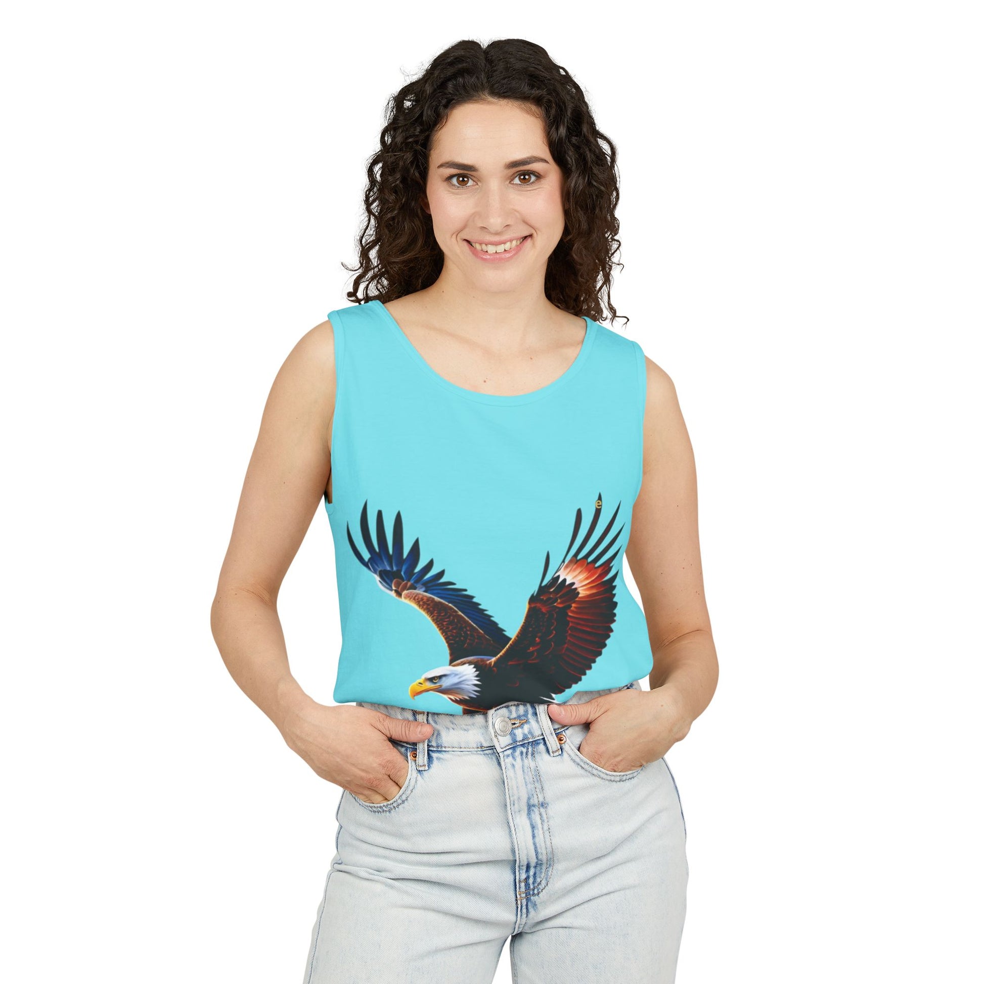 This lightweight garment-dyed tank carries a bold, soaring eagle print that feels both rugged and free. The soft, lived-in color and smooth ringspun cotton hug skin with a relaxed drape — the kind of tank you reach for on warm mornings before a hike, during a road-trip playlist, or at an outdoor weekend cookout. The eagle artwork lands center-front with vivid, layered tones that read like sunlit feathers in flight. Wear it with faded denim, a flannel tied at the waist, or under an open button shirt. It’s quiet confidence you can move in: breathable, durable, and already broken-in the moment you put it on.