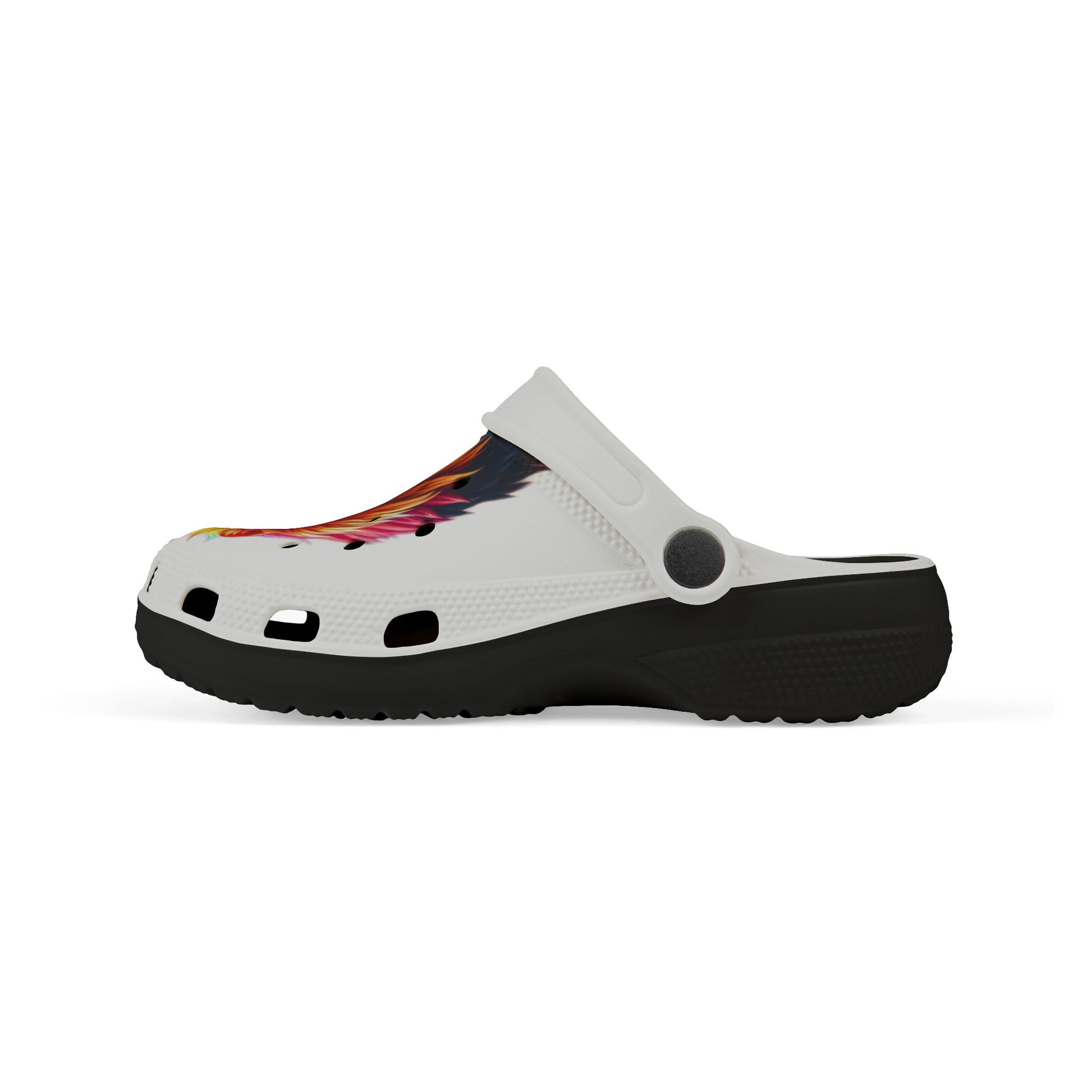 Bright, lightweight clogs that bring playful color and everyday comfort to kids’ adventures. Made from 100% EVA, these slip-on shoes cradle little feet with a curved footbed and flexible sole that moves with every jump, puddle splash, and backyard chase. The printed upper shows a vibrant lion illustration that pops against the white base, while the adjustable strap keeps the clog secure during active play. Comes with fun clog accessory charms to mix and match on the vents. Practical details like EU size embossed on the sole and choice of black or white insole/outsole add simple, thoughtful touches.