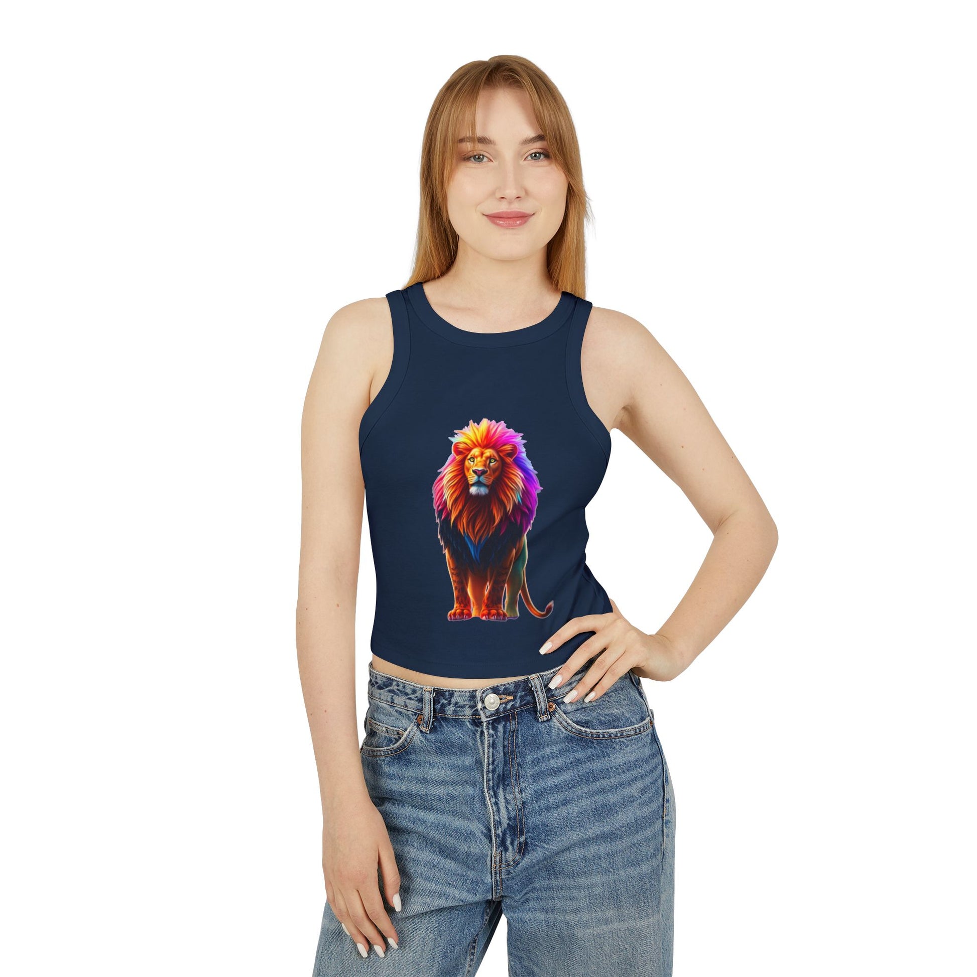This fitted micro-rib racer tank brings bright, bold personality to everyday wear. The mid-length cut and high neckline create a clean, modern silhouette that layers beautifully or stands alone. Lightweight, soft Airlume cotton-blend fabric moves with you, while the micro-rib texture adds subtle stretch and refined detail. A vibrant, multicolored lion print sits front-and-center, turning the tank into a statement piece that feels playful, confident, and artful. Tear-away labels keep the neckline comfortable. Wear it when you want color and character — whether you’re exploring the city, heading to a casual meet-up, or building a layered look for a warm-weather outing.